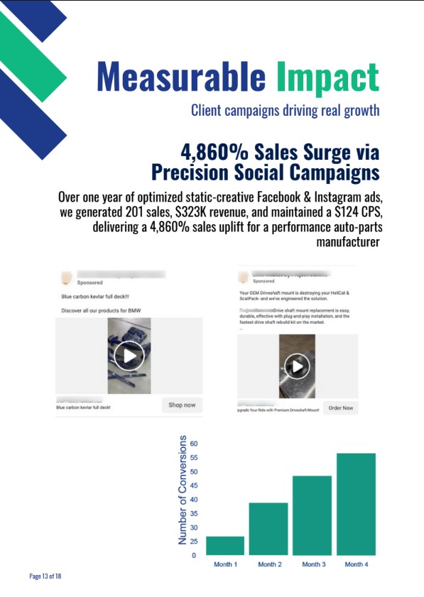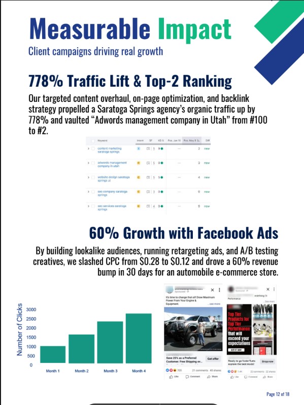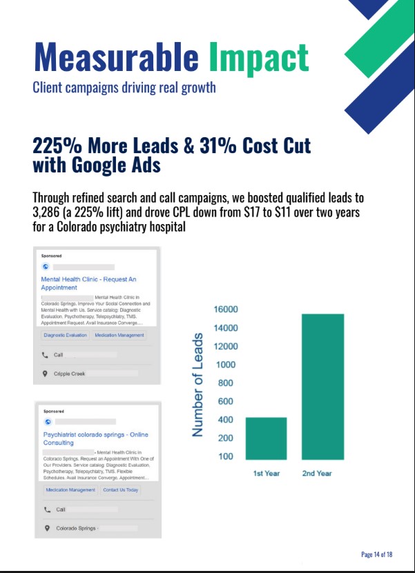Everything from e-commerce auto parts (4,860 % sales surge in 12 months) to professional services (psychiatry hospital: 225% more leads, 31% lower CPL). Your creative expertise + our vertical experience equals faster wins.